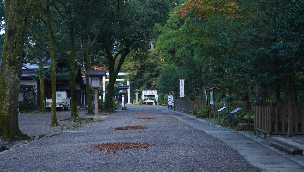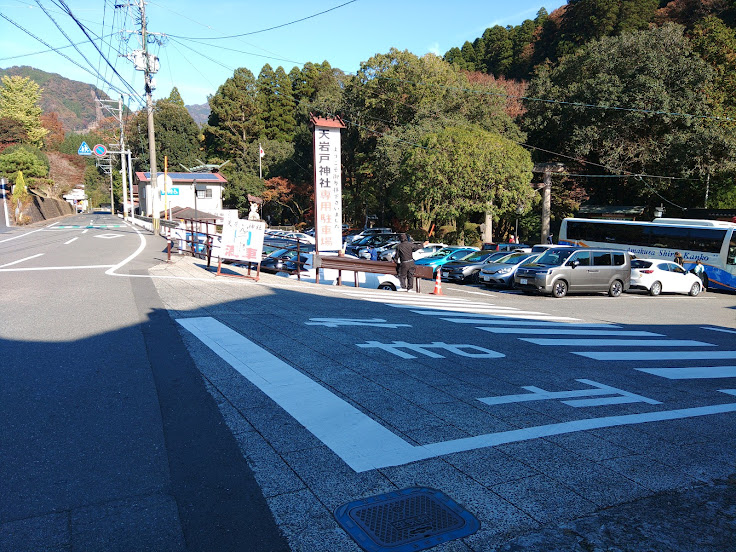 県道204号線・緒方高千穂線沿いに、駐車場の入り口があります。平日でも満車になっている事が多いので、なるべく早い時間に参拝する事をお勧めします。