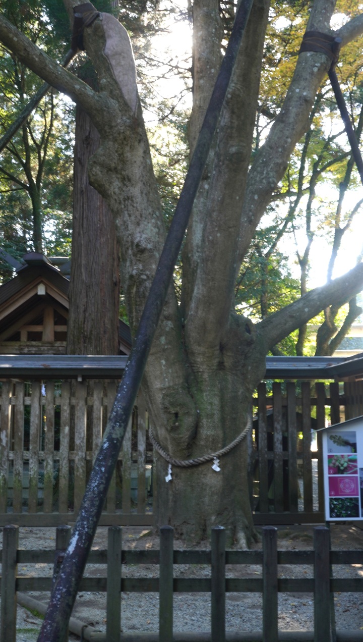 拝殿の右側に招霊の木(おがたま の き)があります。天岩戸伝説で天鈿女命(あめのうずめ の みこと)はこの木の枝を持って踊ったとされています。神楽で使う神楽鈴(かぐらすず)は、この木の実が原型だと言われています。