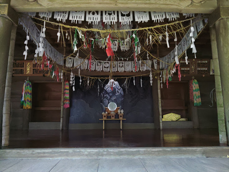 御神門から拝殿(はいでん)を望みます。御祭神は天照大神こと大日孁尊(おおひるめのみこと)ですが、御神体は岩戸川の対岸にある天岩戸です。