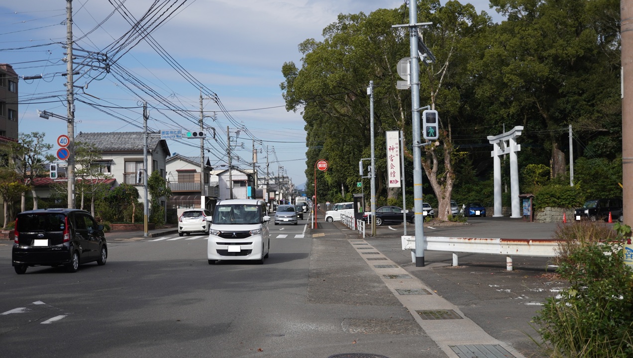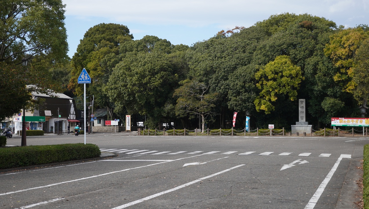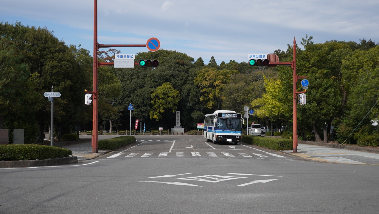 神宮参道こと県道44号宮崎高鍋線、宮崎神宮前交差点から、社号標を望みます。