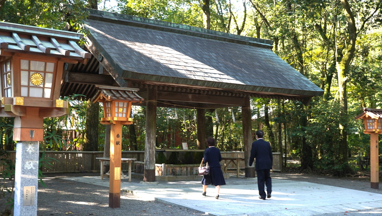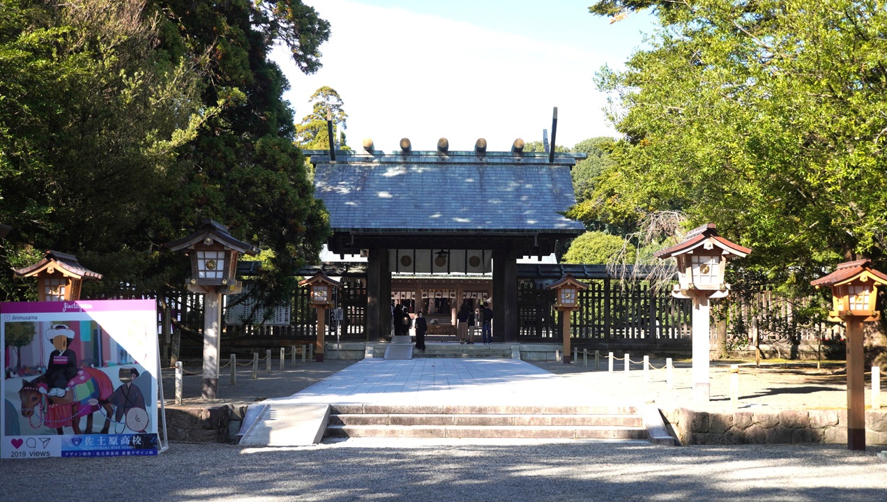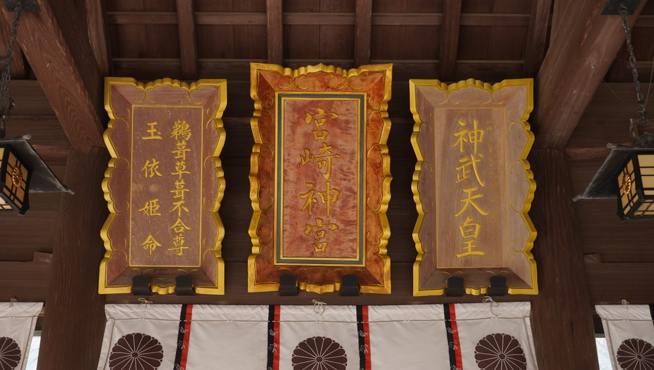 拝所の扁額を正面から。御祭神は初代・神武天皇と、その父である鸕鶿草葺不合尊(うがやふきあえず の みこと)、母の玉依姫(たまよりびめ の みこと)です。