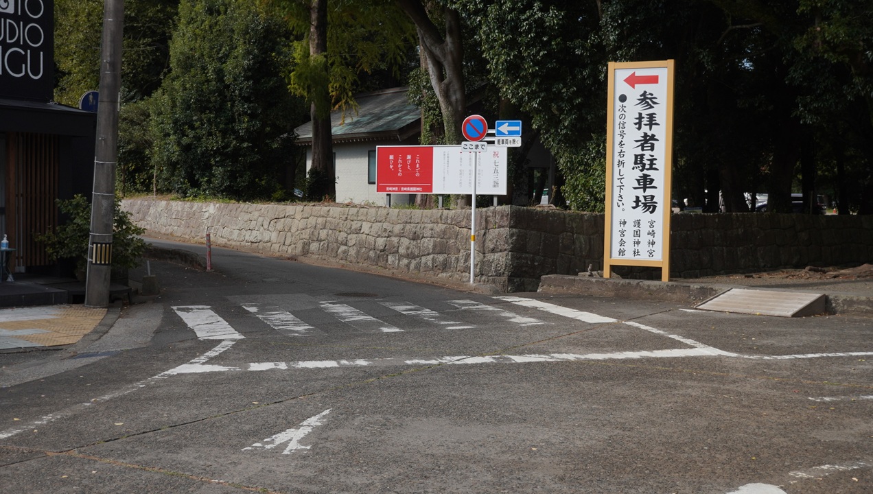 一方通行の終わり右側に、神宮会館の看板が出ています。やや大回りになりますが、宮崎神宮前交差点から、県道44号線を進む方が分かり易いかも知れません。