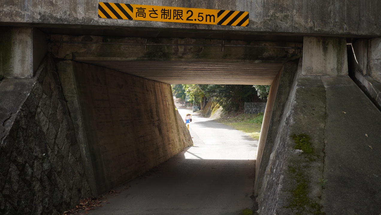 国道27号線の下を通って、参道を進みます。高さ制限は⒉5mで、子供の飛び出しや、クルマのすれ違いも多いので要注意!