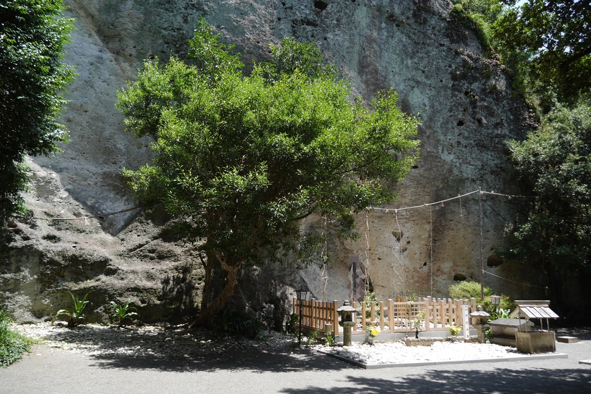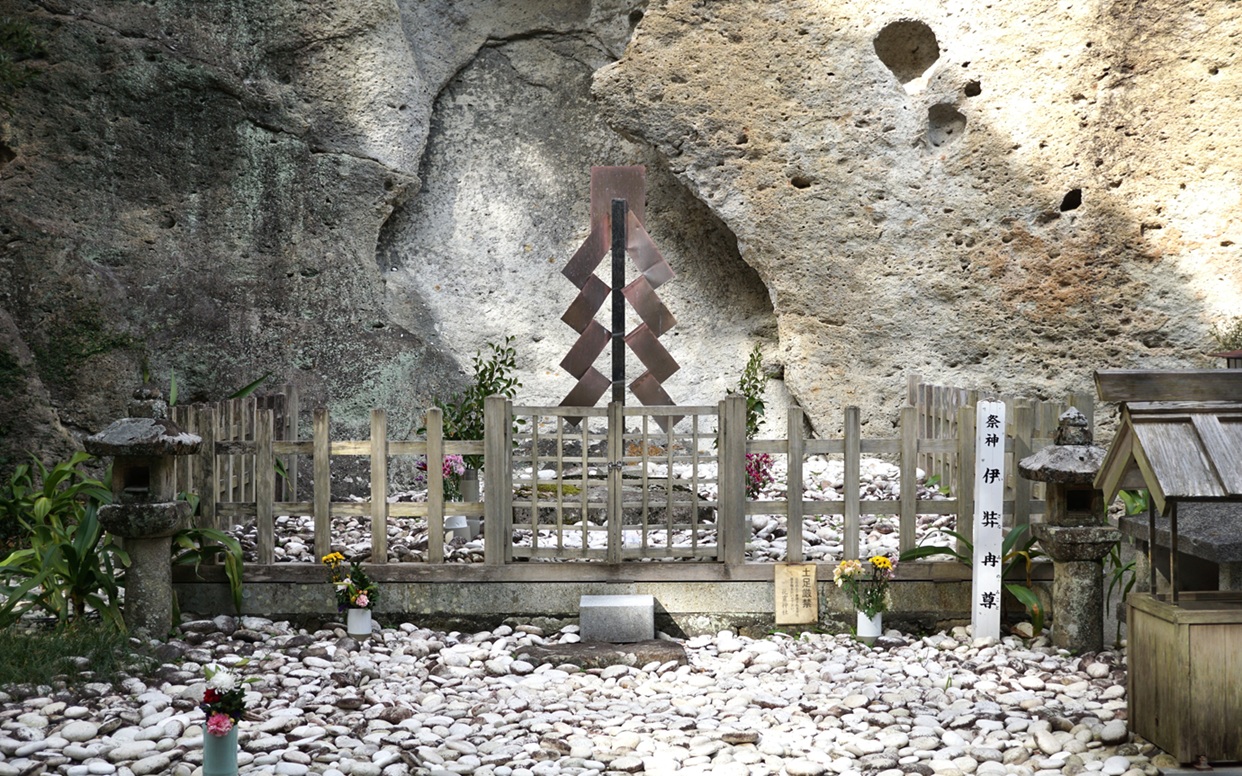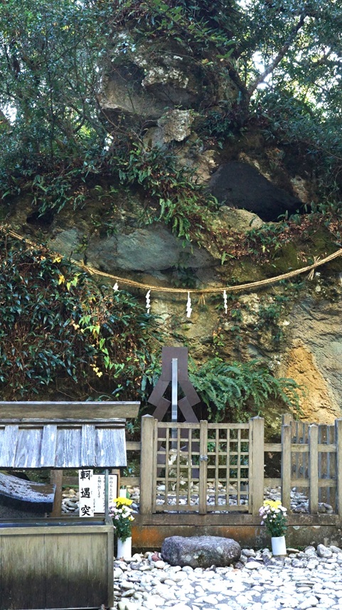 御神体の磐座(いわくら)を斜めから。ここに伊弉冊尊(いざなみ の みこと)が葬られたと言い伝えられています。