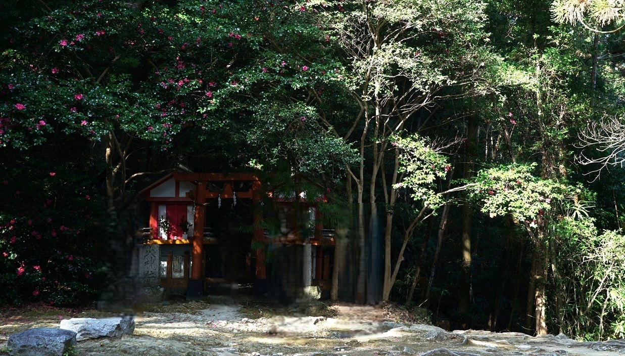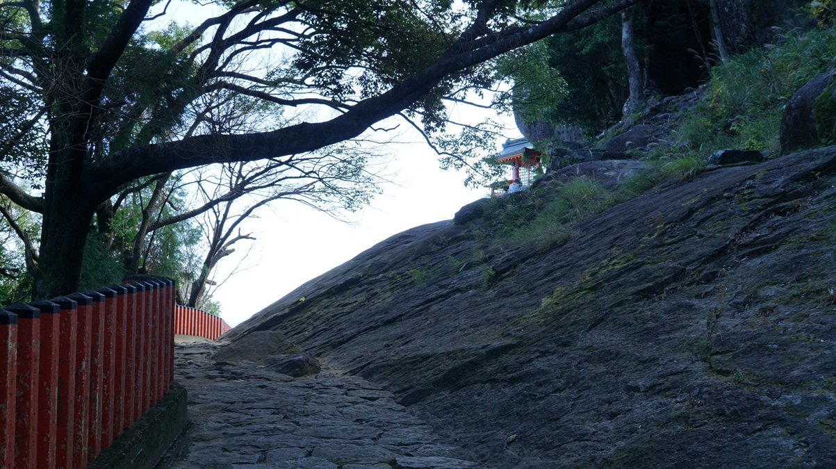 神倉神社と、御神体のゴトビキ岩を望みます。御祭神は天照大神(あまてらす おおみかみ)と、建御雷命(たけみかづち の みこと)から神剣・布都御魂(ふつ の みたま)を預かり、初代・神武天皇に渡した高倉下命(たかくらじ の みこと)です。