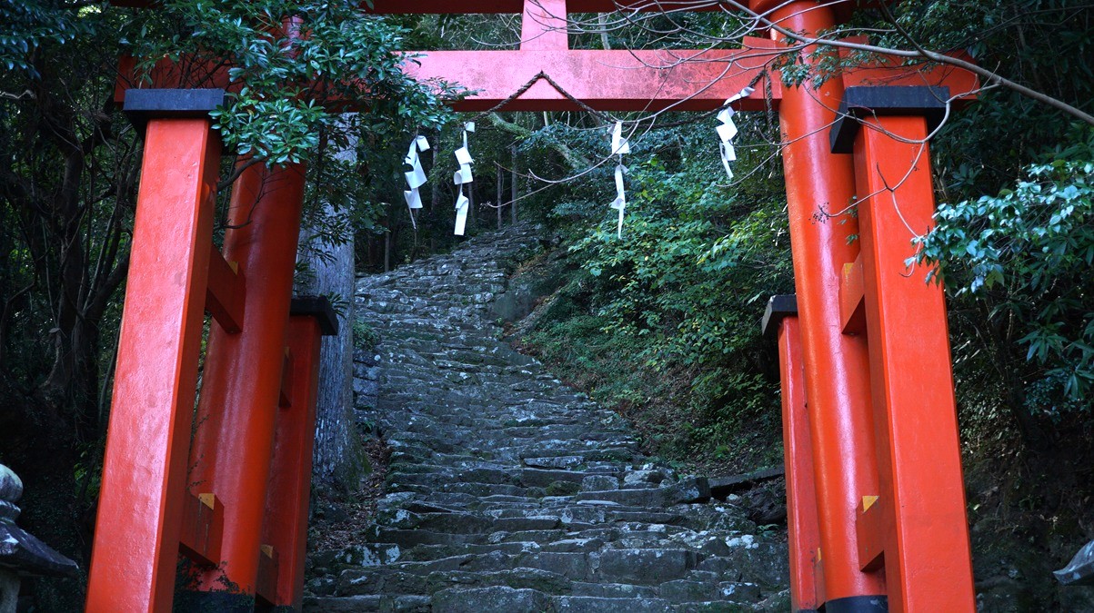 神倉神社の石段は538段もあり、急勾配かつ不規則な形状をしているので、鳥居の前にある杖を借りて登りましょう。毎年2月6日には、白装束で松明を持った男性達が石段を駆け降りる奇祭・御燈(おとう)祭りが行われます。