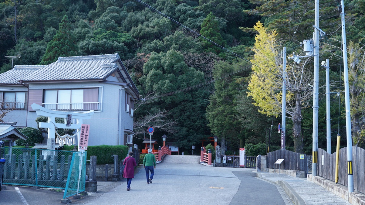 参道を道なりに歩いて行くと、朱塗りの大鳥居が見えてきます。