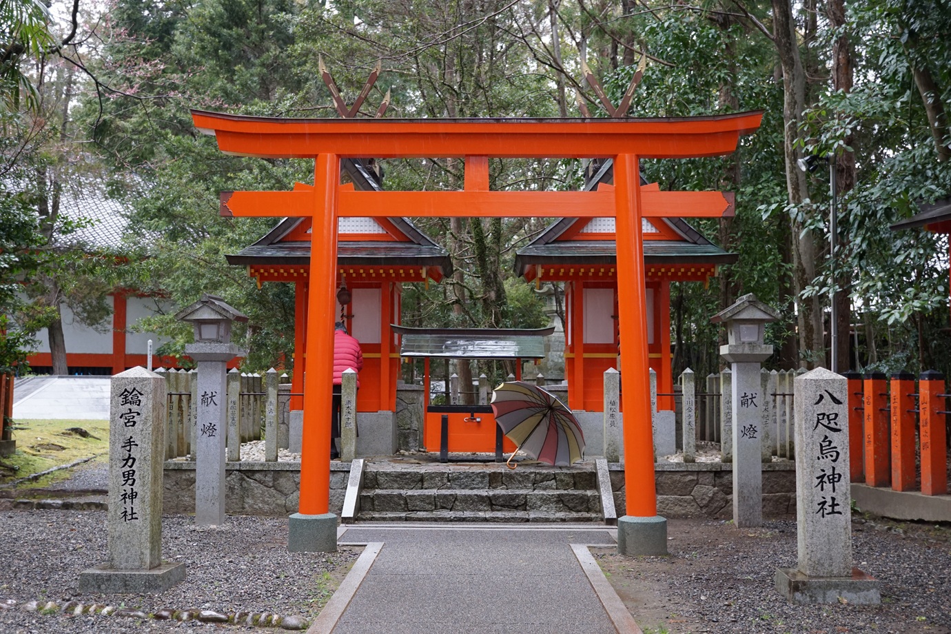 参道の鳥居をくぐった先に、八咫烏神社(やたがらす じんじゃ)と手力男神社(たじからお じんじゃ)があります。八咫烏は高皇産霊尊(たかみ むすび の かみ)によって遣わされ、初代・神武天皇を大和(奈良)に導いたとされています。