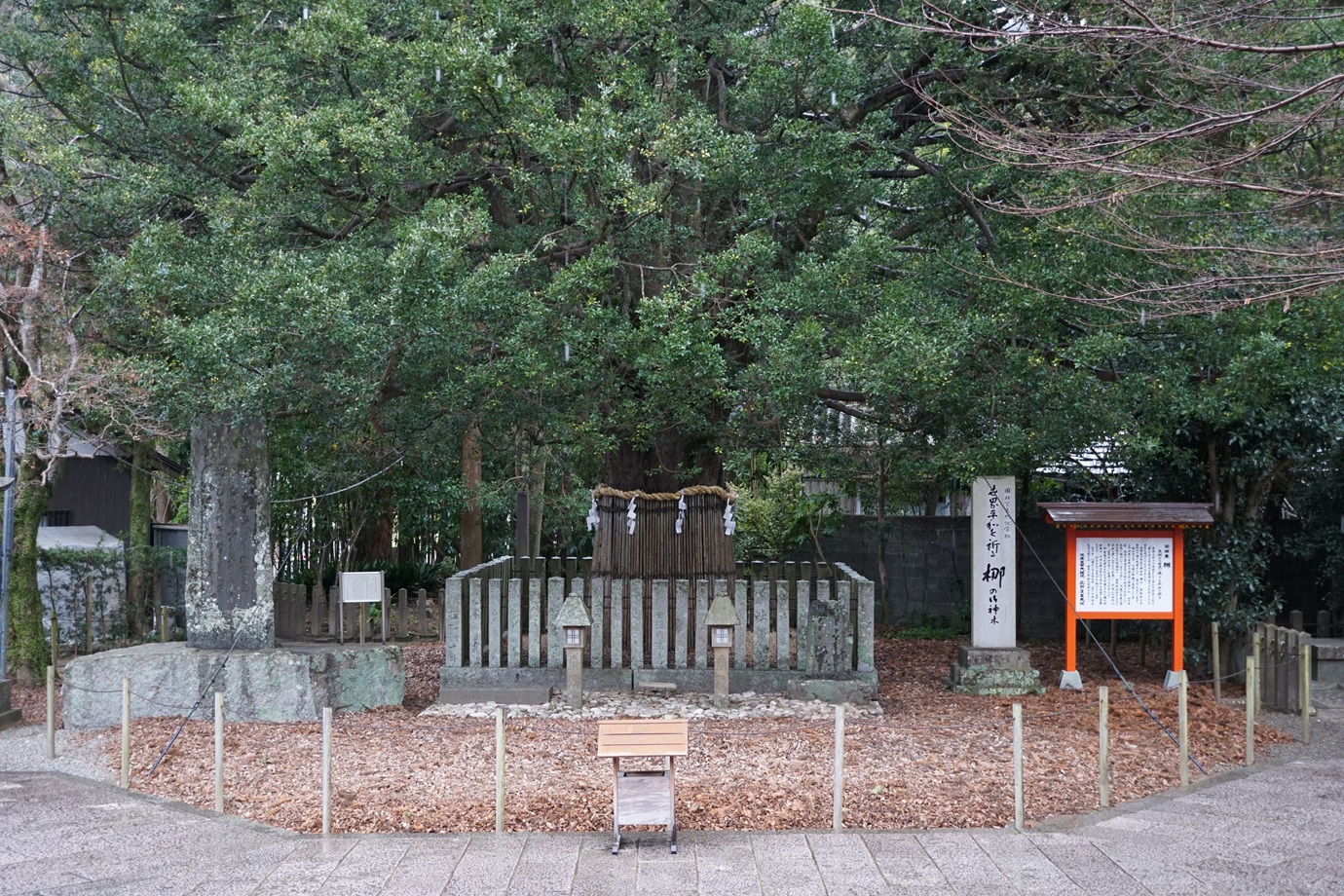 梛の木は、平重盛(たいら の しげもり)が植え、樹齢1000年以上と言い伝えられています。木の葉を持ち帰ると、魔除けになると言われています。