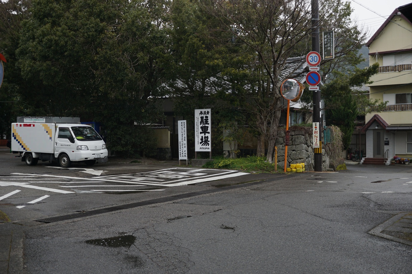 駐車場の入り口です。観光バスの出入りもあるので注意が必要です。