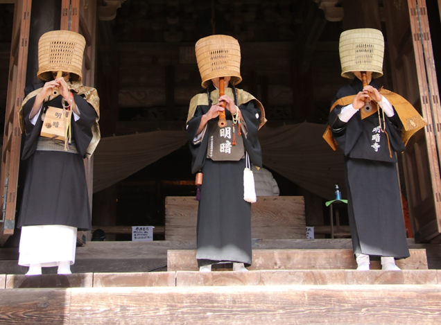 普化宗の僧侶は虚無僧(こむそう)と呼ばれ、天蓋(てんがい)と呼ばれる深編笠を被り、尺八を吹きながら托鉢(たくはつ)をしました。これは時代劇でお馴染みのスタイルですね。